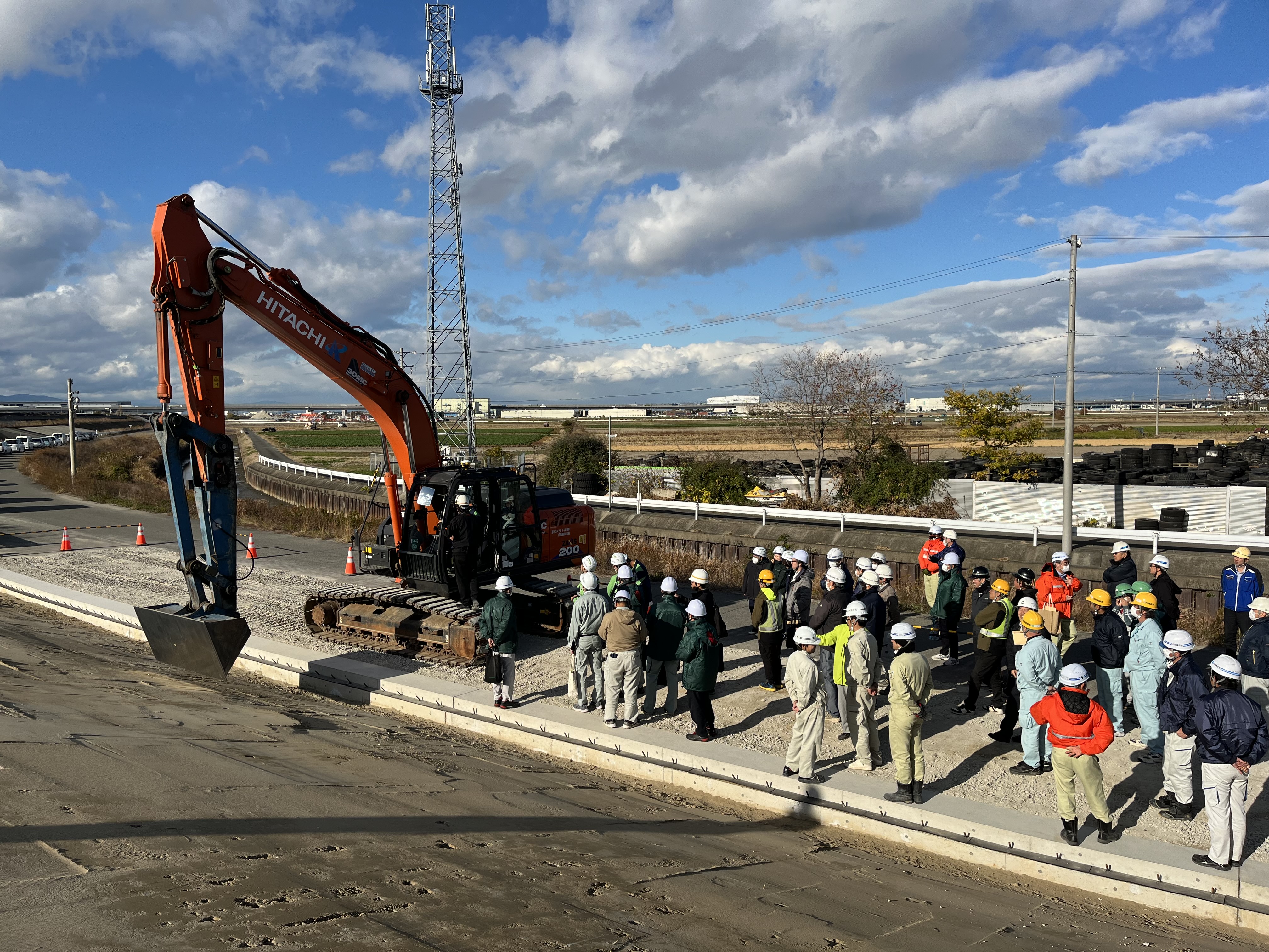 対象工事は、弥富市鍋田町で施工されている「海岸整備事業 鍋田地区 堤防工その33工事」のうち、堤防復旧工の堤防法面整形工事におけるMC(マシンコントロール)バックホウ施工です。