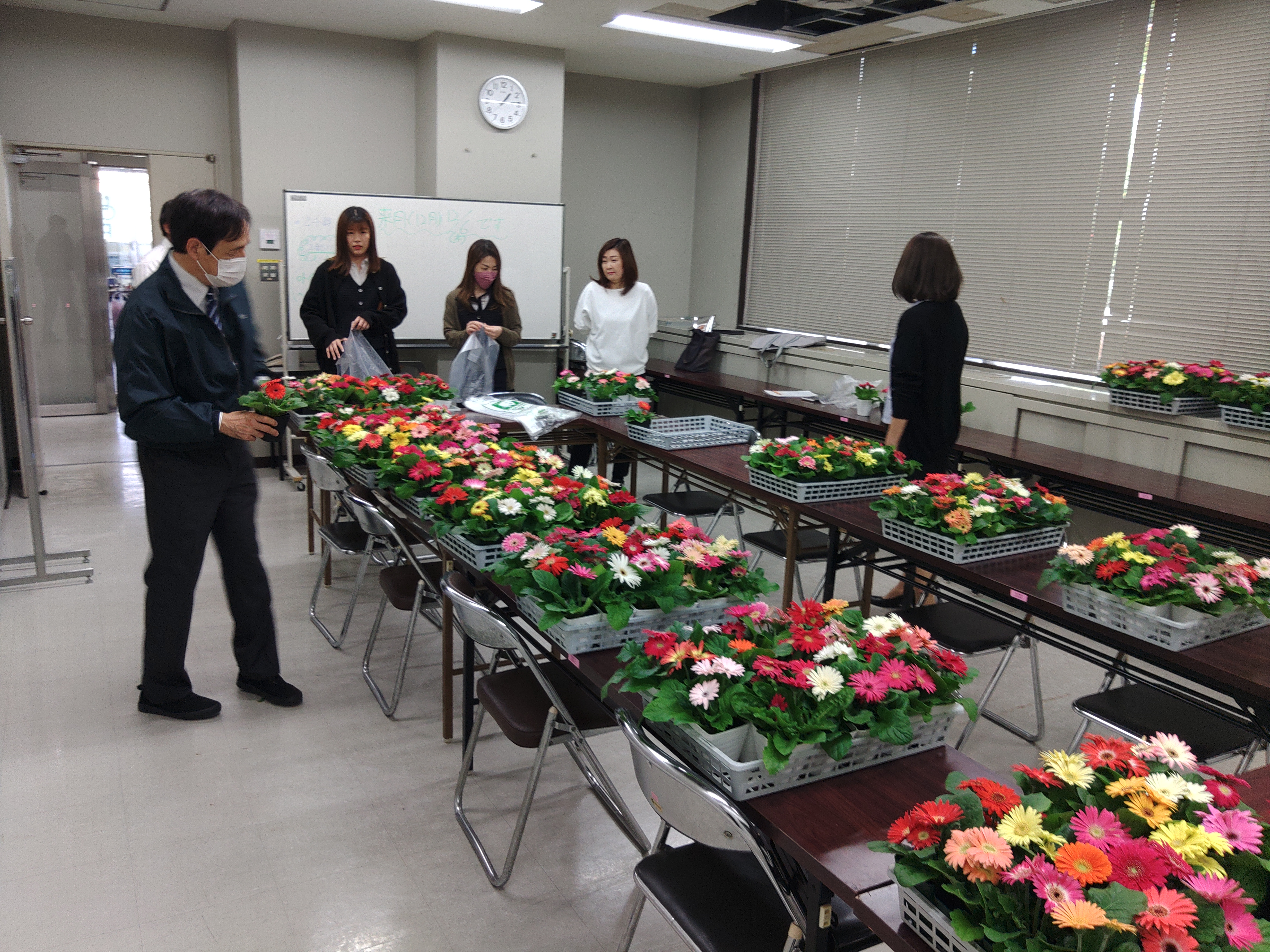 今回の写真は、11月9日のミニガーベラの配布状況です。いろんな色があり、みなさん(会員各社)迷いながら選んでいました。