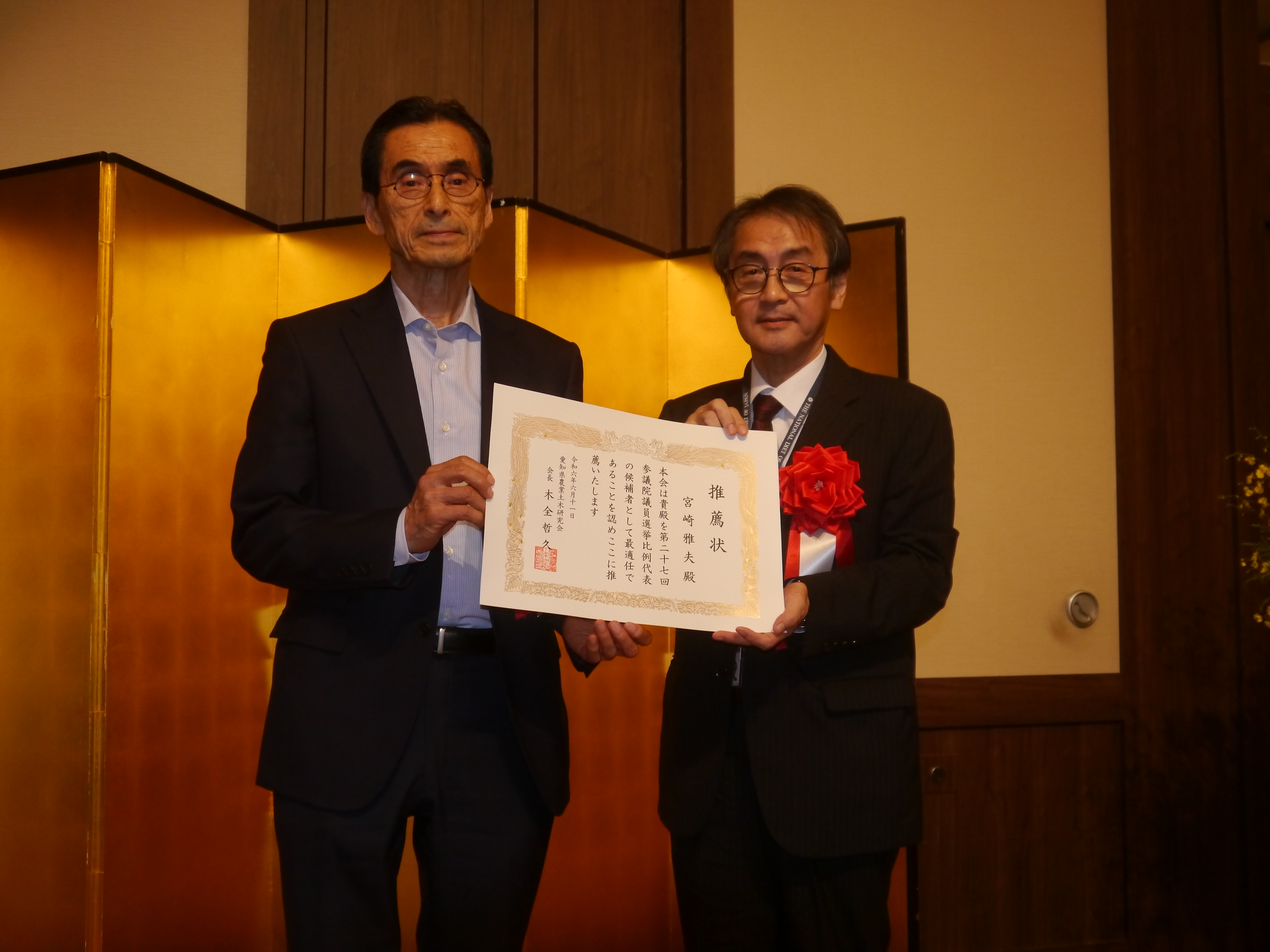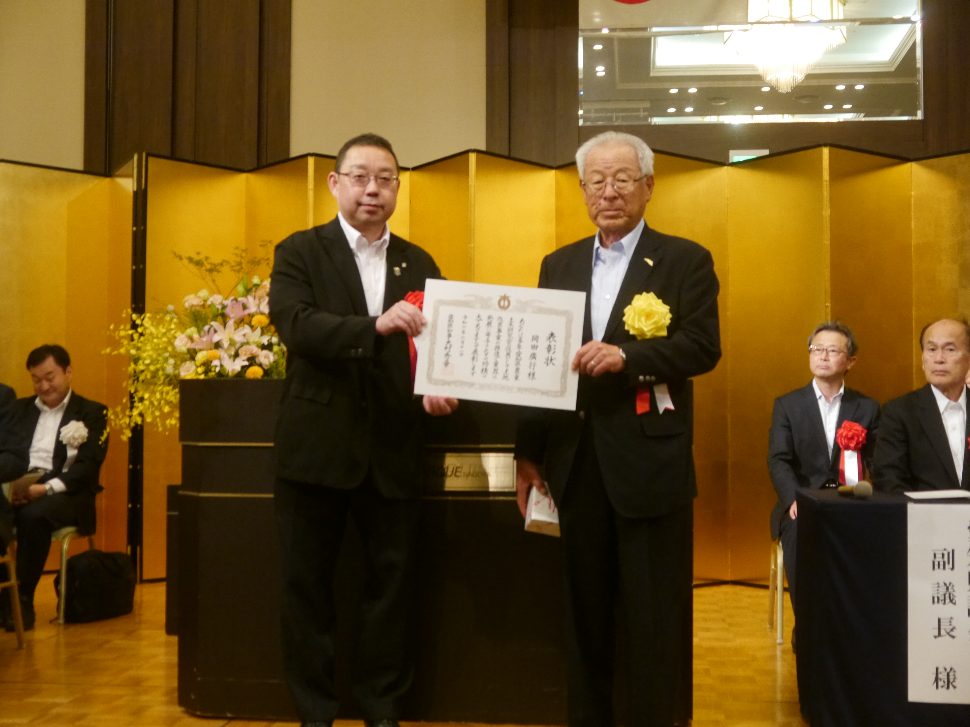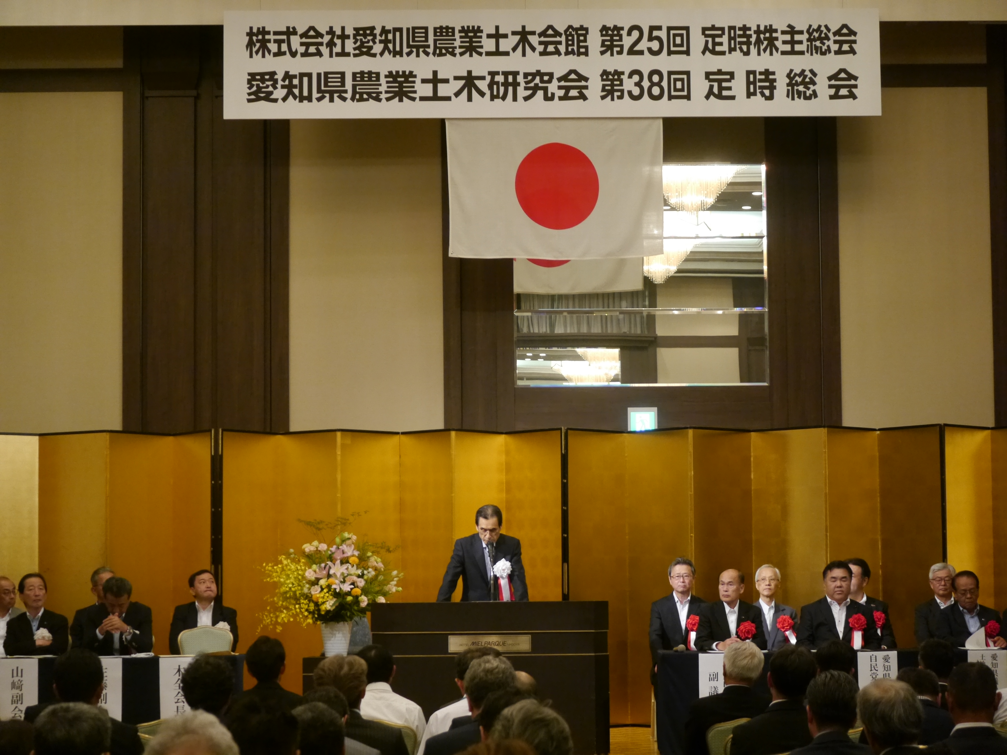 〇令和6年6月11日㈫ 名古屋市内のホテルメルパルク名古屋において、㈱愛知県農業土木会館第25回株主総会及び愛知県農業土木研究会第38回定時総会が開催されました。いずれもすべての議案が承認されたほか、研究会総会では、これまで土地改良事業に功績のあった会員と従業員の皆様に知事表彰、会長表彰が贈られました。 また土地改良の仲間として国政の場で大車輪の活躍をされておられる宮崎雅夫参議院議員に対し、来年の参議院議員選挙における推薦動議が急遽提案され、満場一致で宮崎議員の推薦が決まりました。
